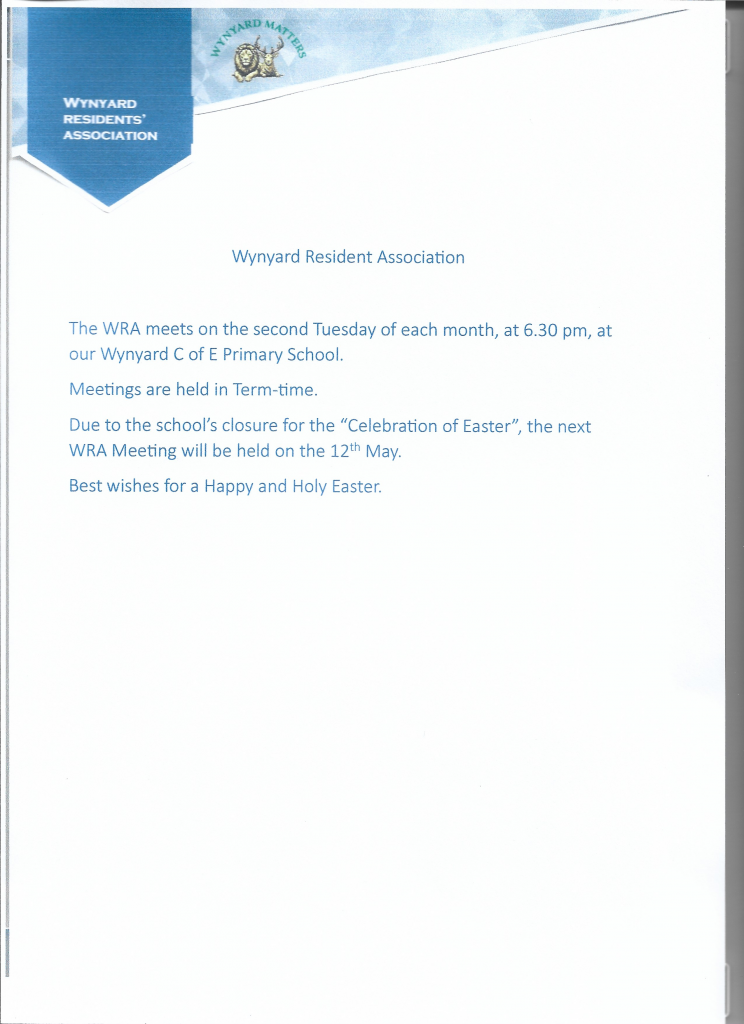 The WRA meets on the second Tuesday of each month at 630PM at Wynyard C of E Primary School.